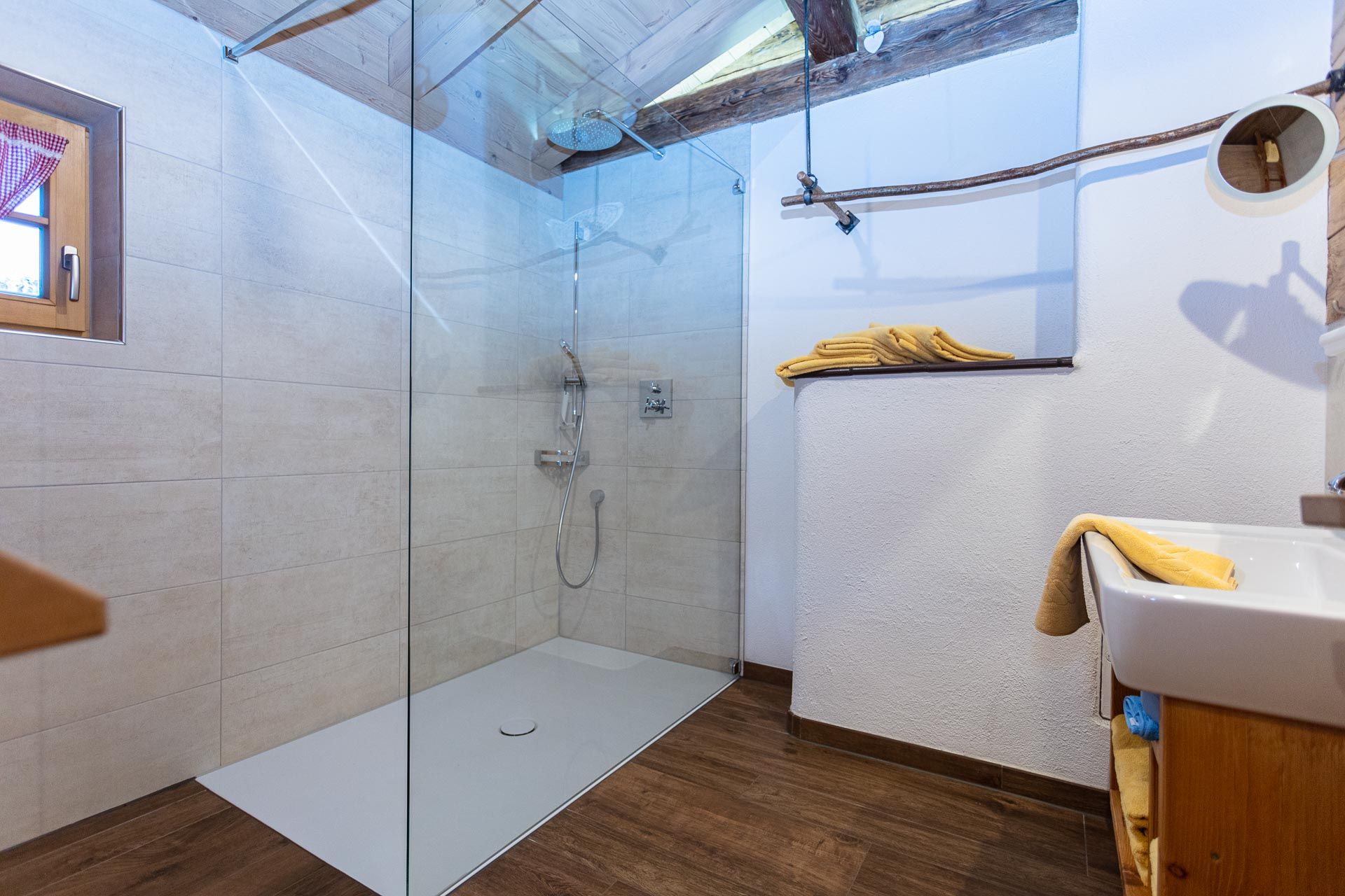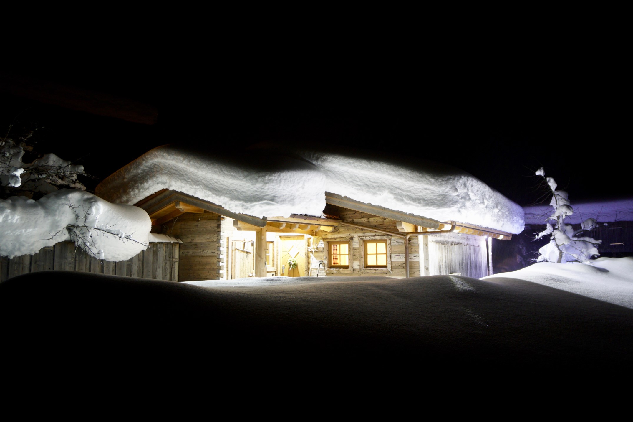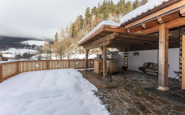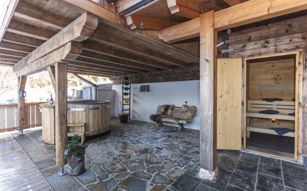 Von der Terrasse aus geht es direkt in die private Sauna. Keine kleine Schachtel, in der man Platzangst bekommt, sondern ein richtiges kleines „Saunahaus“ aus gehacktem Fichtenholz, mit Fenster zur Terrasse – damit man auch hier die traumhafte Aussicht auf das Salzburger Saalachtal genießen kann. Für die anschließende Abkühlung sorgen im Winter der Schnee vor der Hütte, im Sommer die Gartendusche oder der (ungeheizte) Hot-Pot. Oder Sie heizen den Hot-Pot und entspannen im warmen Wasser mit Bergblick.